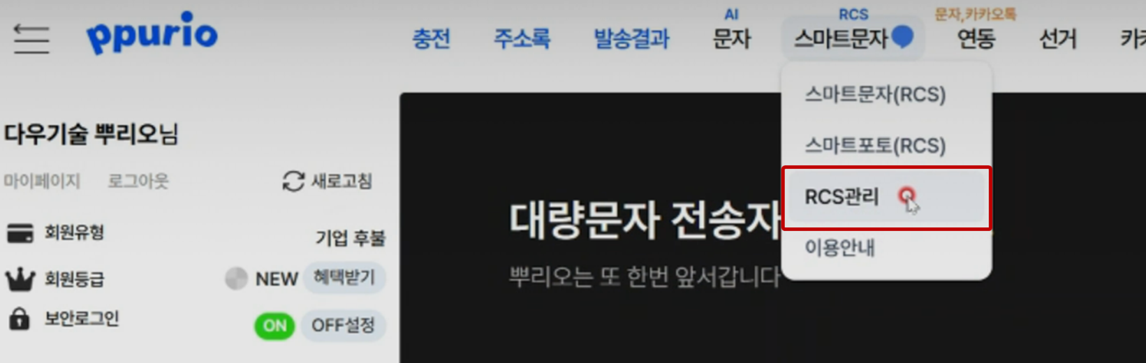 - 해당 정보를 복사한 뒤 뿌리오 홈페이지에 접속 → [RCS > RCS관리] 메뉴를 클릭해주세요.