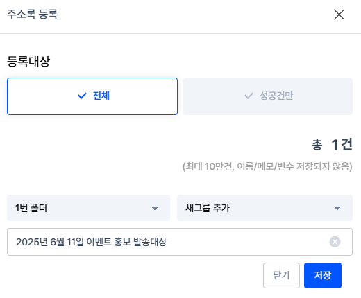 TIP. 전체 대상은 물론, 성공건만 분류하여 주소록으로 간단하게 저장하실 수 있습니다.