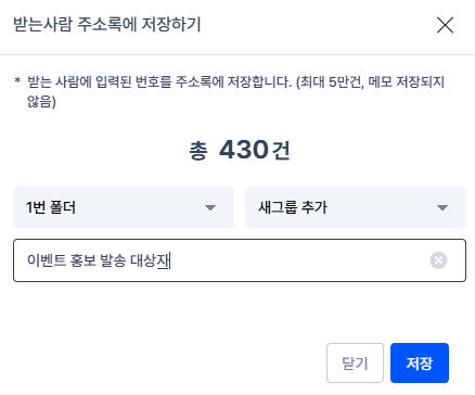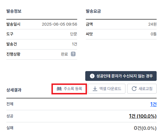발송결과 페이지에서 [주소록 등록] 기능을 사용해보세요.