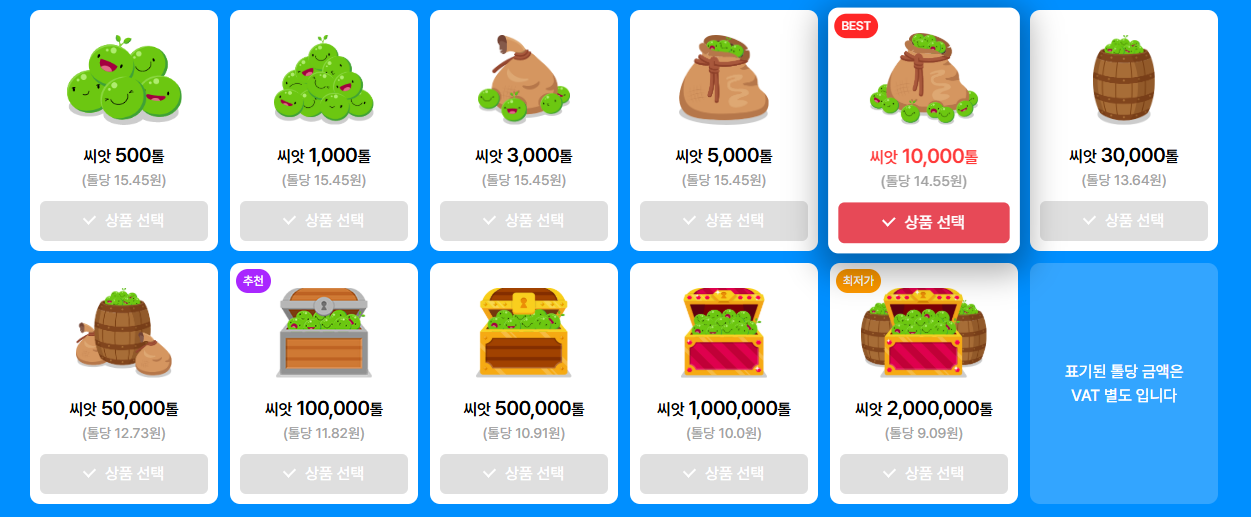 여기서 중요한 사실! 씨앗은 구매량에 따라 최대 58%까지 할인되고 있는데요.