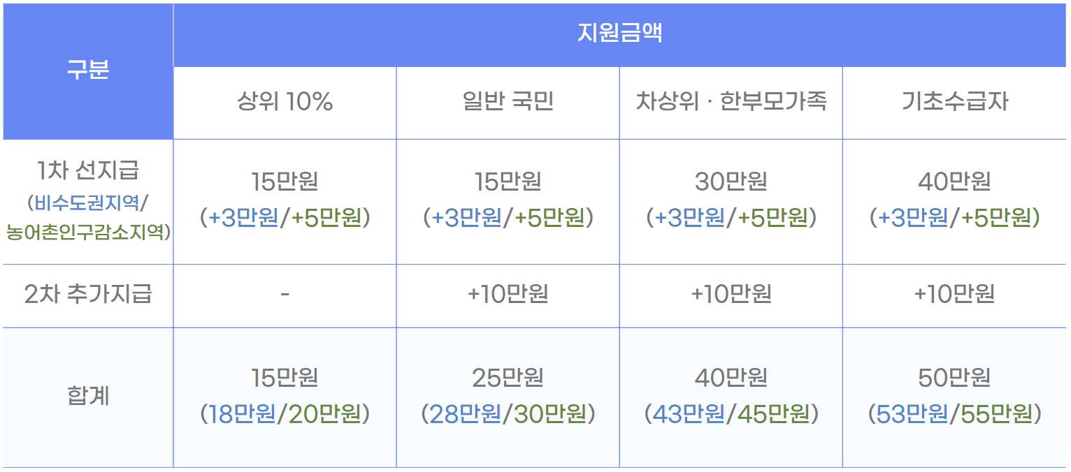 - 1차 : 전 국민에게 1인당 15만원 (차상위/한부모 30만원, 기초수급자 40만원) 우선지급