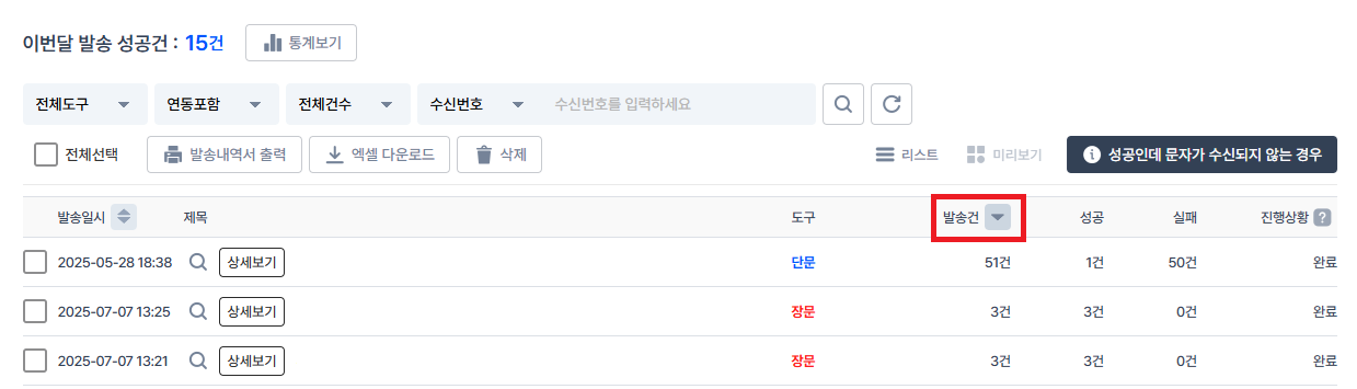 발송건 우측의 화살표를 클릭하시면 '발송건수 내림차순' / '오름차순'으로 정렬을 변경하실 수 있습니다.