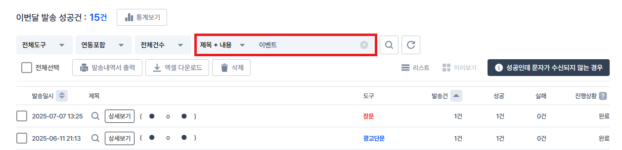 발송결과는 기본적으로 '발송일시' 기준 최신순으로 정렬되는데요,