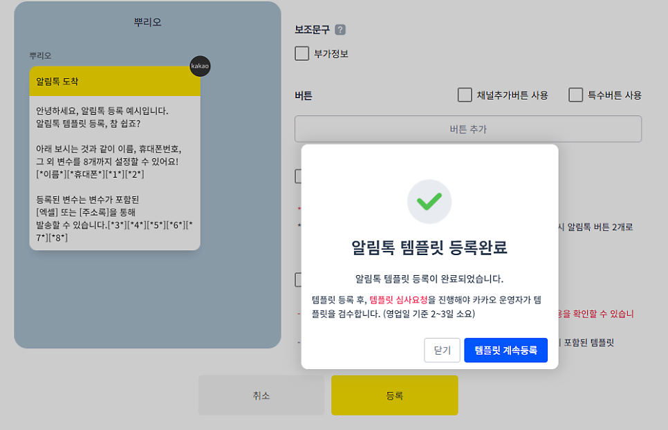 템플릿 승인에는 약 2일~3일의 기간이 소요되므로 빠른 이용을 원하신다면 가입 즉시 템플릿을 등록 후 심사요청을 하도록 해야합니다.