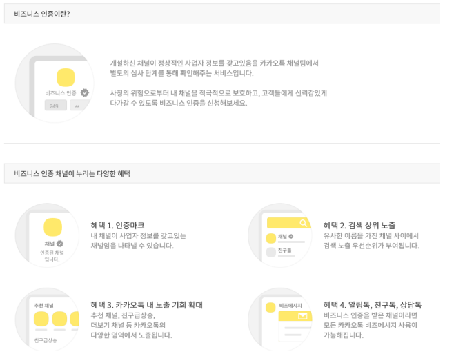 이어서 비즈니스 인증을 해주셔야 하는데요, 비즈니스 인증을 하지 않을 경우 알림톡과 친구톡 사용이 불가합니다.