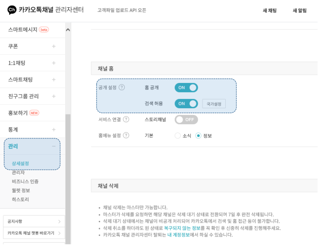 채널 가입을 하신 후에는 채널 관리자 센터에서 홈 공개와 검색 허용을 전부 ON으로 설정하셔야 합니다. 공개 설정을 하지 않을 경우, 알림톡/친구톡 발송이 중지되니 주의해주세요!