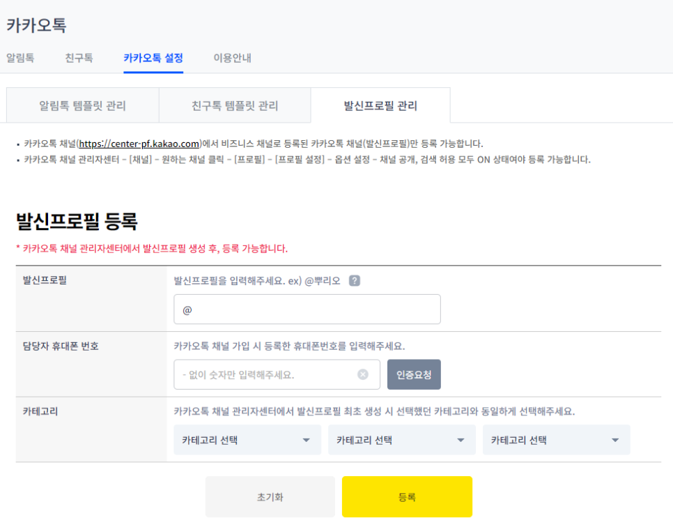 마지막으로 가입한 카카오톡 채널 아이디를 뿌리오에 등록합니다. 발신프로필, 휴대폰번호, 카테고리를 선택 후 [등록] 버튼을 클릭해주세요.
