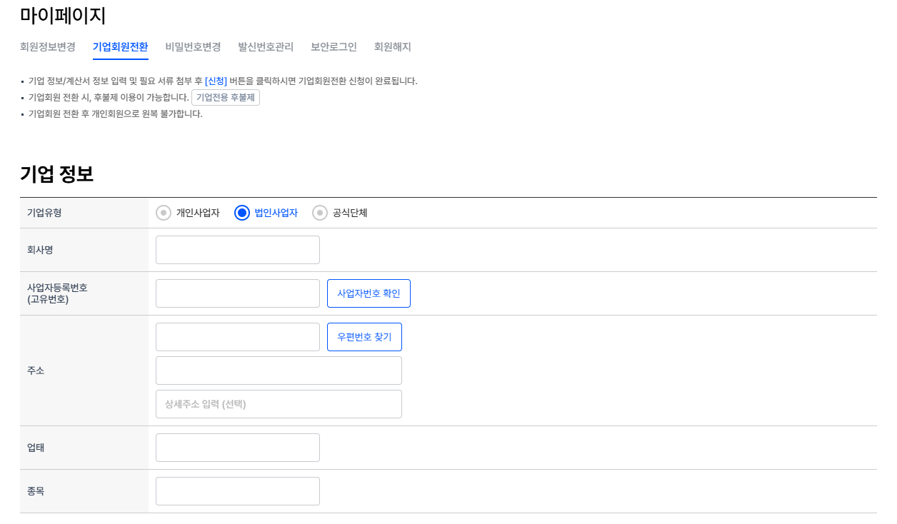뿌리오 기업회원은 로그인 후 [마이페이지 > 기업회원전환] 메뉴에서 신청할 수 있습니다.