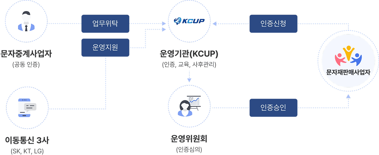 인터넷망을 이용하여 다량의 문자전송서비스(Web발신 문자)를 제공하는 문자재판매사가 서비스를 시작하기 전 문자중계사업자로부터 전송자격을 인증받아야만 문자를 전송할 수 있어요.
