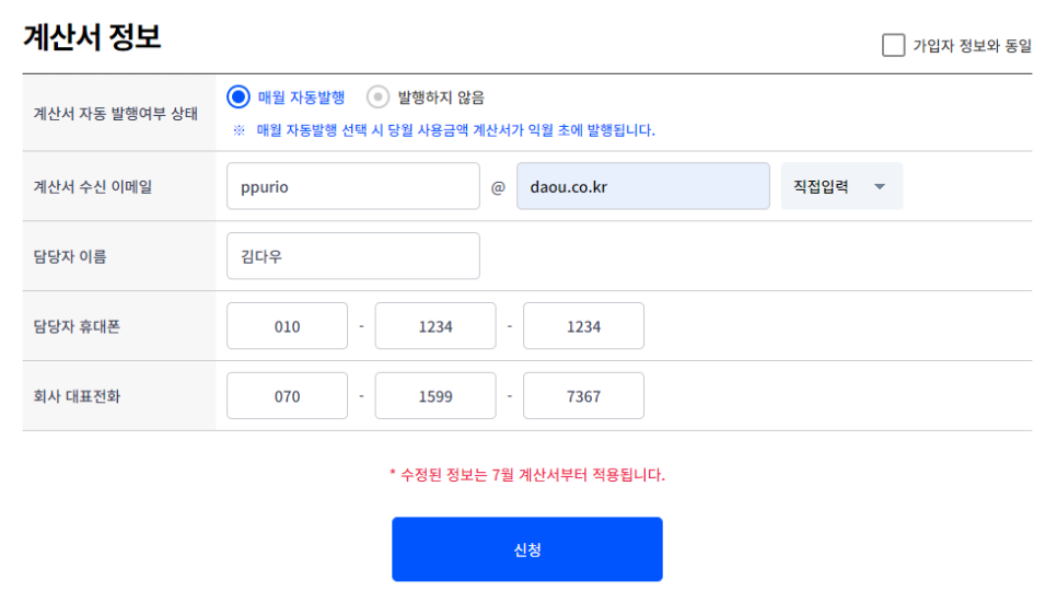모든 기업 정보를 입력해주셨다면 하단에 있는 계산서 정보를 추가로 입력해주세요.