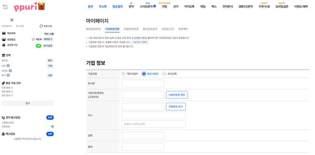 기업회원 등록을 위해서는 직접 신청이 필요한데요, 신청을 위해 뿌리오에 로그인 후 [마이페이지 > 기업회원전환] 메뉴로 이동해 주세요.