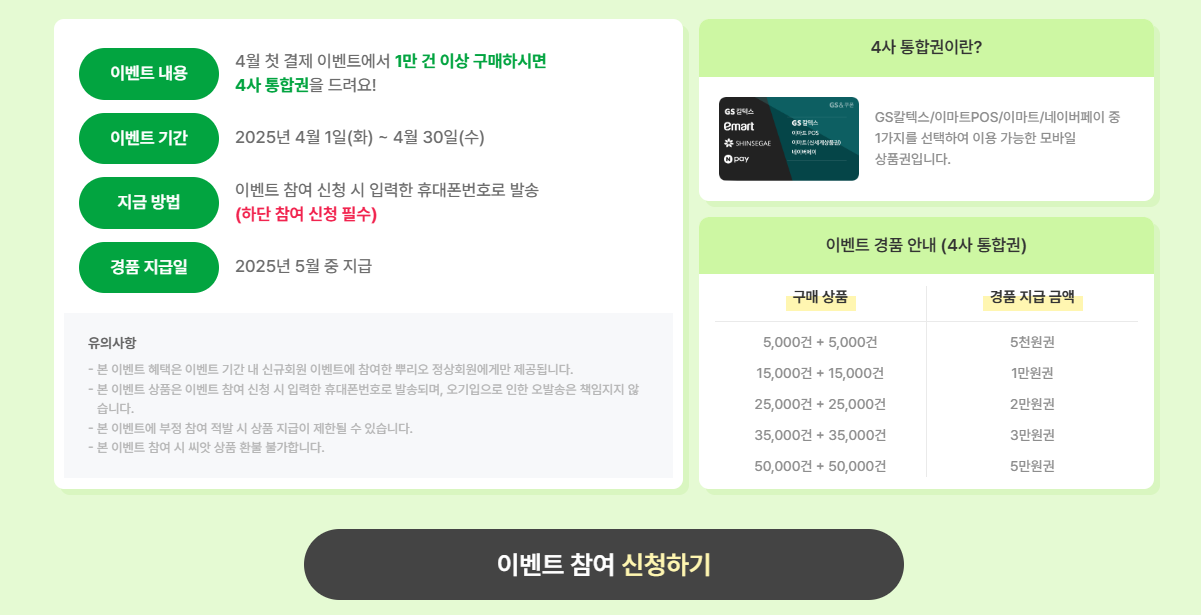 바로 첫 결제 이벤트에서 1만건 이상 구매하시는 고객님께 4사 통합권을 증정해드리는 것인데요, 4사 통합권은 GS칼텍스, 이마트POS, 이마트, 네이버페이 중 1가지를 선택하여 이용 가능한 모바일 상품권입니다.